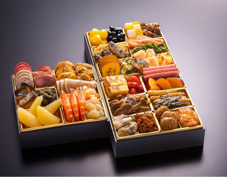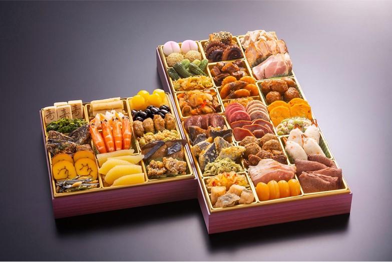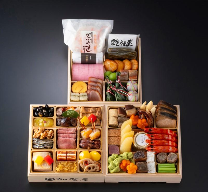 【博多久松】福岡県おせちは伝統派が良いと言う少人数のご家族様に自信を持っておすすめします。三段重に詰め込んだ数々の和洋折衷の食材は全てが美味。