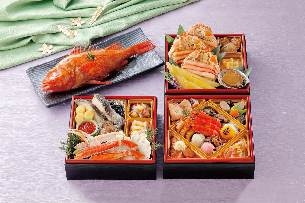 【札幌市中央卸売市場発】北海道札幌市中央卸売市場は全国から沢山の食材が集まる味覚の宝庫です。その中から目利きのエキスパート「せり人」が選りすぐった食材を新年を迎えるにふさわしいおせち料理として重箱に盛り込みました。銀鱈の煮付け、オオズワイガニの甲羅盛りなどがお楽しみいただけます。